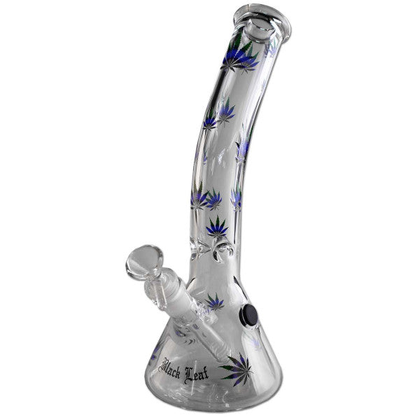 Stylische Beakerbong von Black Leaf aus Borosilikatglas mit farbigem Hanfblatt-Design und Ice-Kerben für kühlen Rauch.